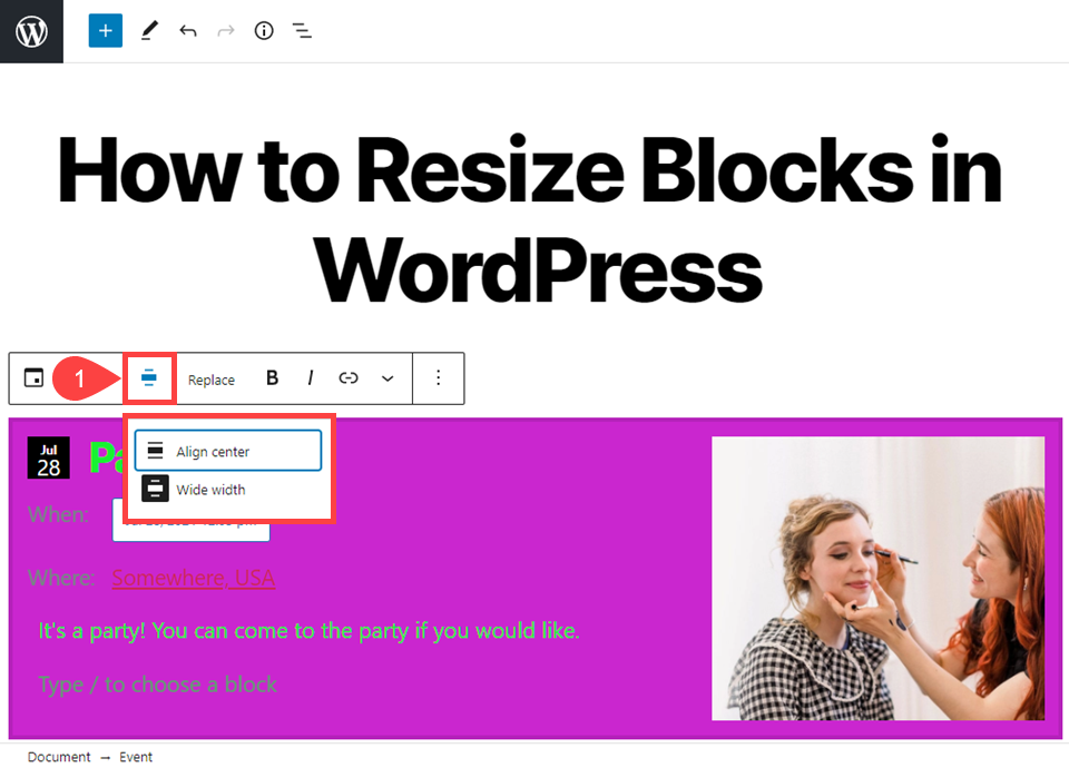 对于活动区块,调整大小设置仅在编辑器本身的上下文菜单中。(Event Block是您将安装的Automattic的一个单独插件,它不是古腾堡核心编辑器的一部分。)