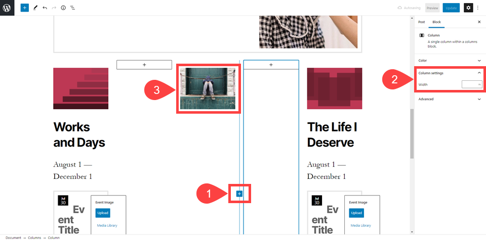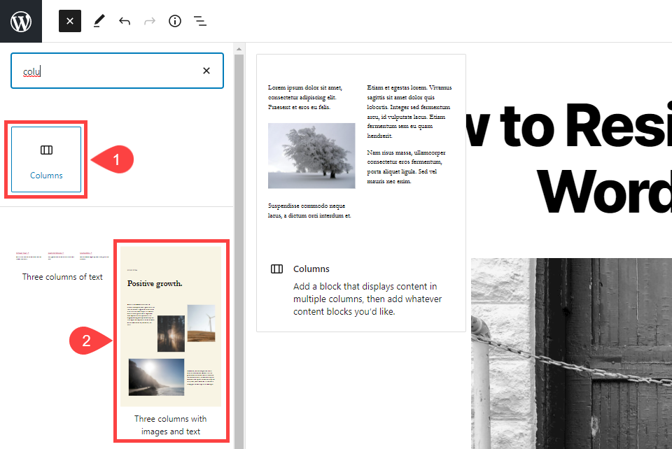 如果您需要调整大小的区块在其设置面板或上下文菜单中没有调整大小选项,则使用区块编辑器的栏目是您可以调整任何块大小的另一种方式。只需按任意+ 按钮搜索栏目区块即可添加新区块。