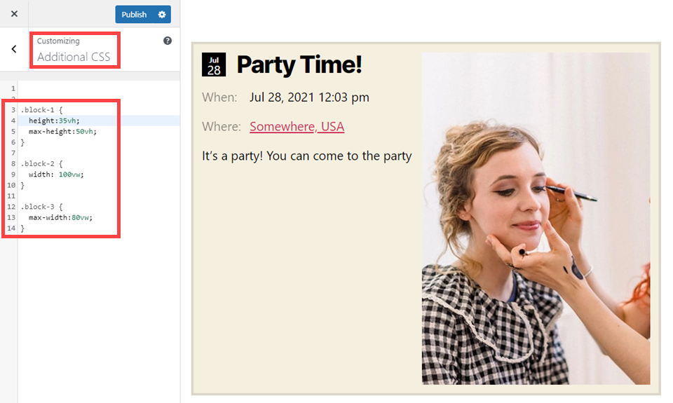 现在,您应该导航到外观– 自定义并在最底部找到额外CSS部分。编写或粘贴CSS代码以根据您的喜好调整区块的大小。