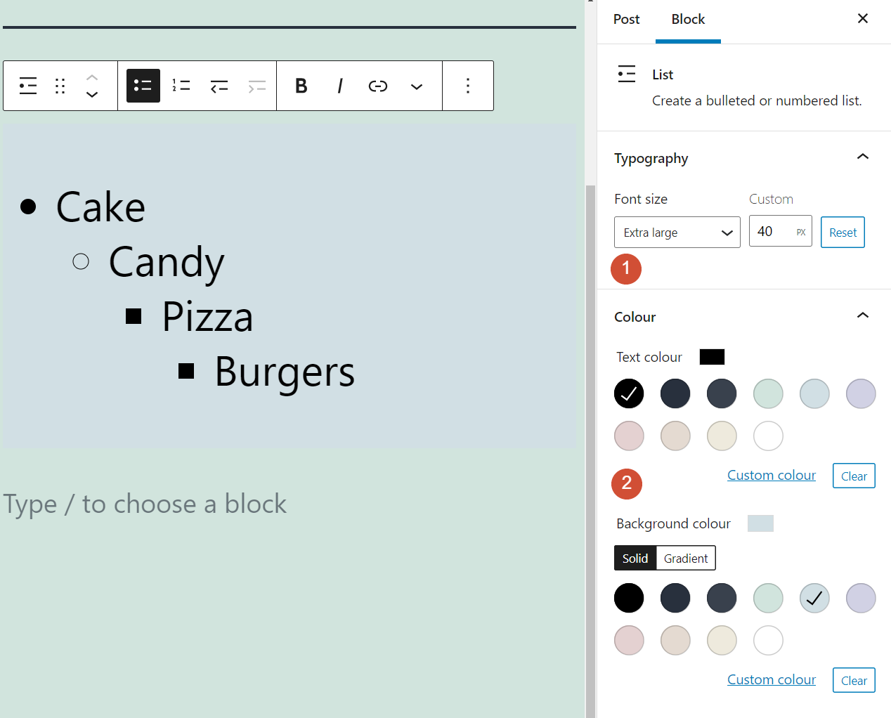 选择列表区块后,您将能够开始处理新列表。该过程的下一部分很简单。您可以在无序(项目符号)或有序(编号)列表之间进行选择,然后开始添加条目,直到您满意为止: