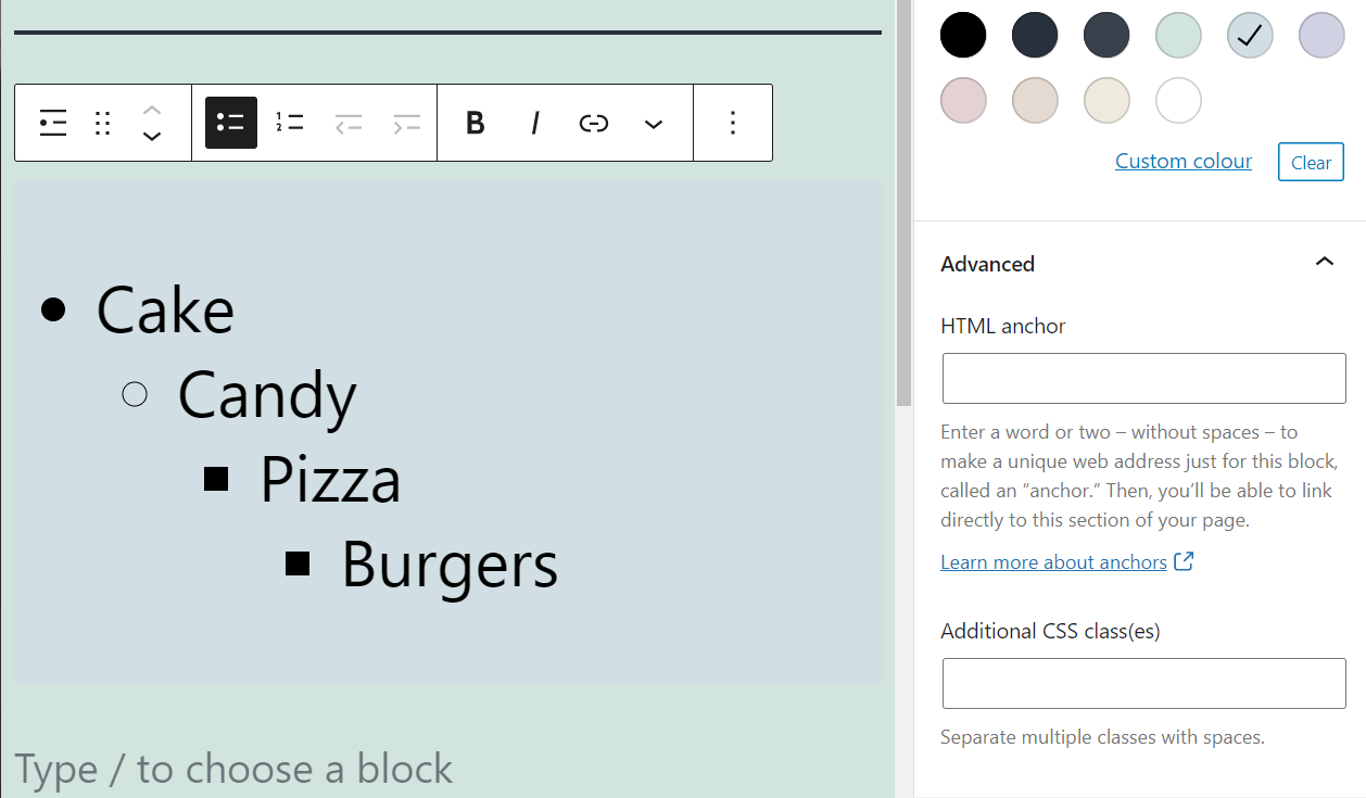 请记住,字体大小和颜色设置适用于整个列表,而不是单个条目。如果您想进一步自定义列表的样式,则需要使用CSS 类和HTML锚点。为此,请打开块 设置菜单下的高级选项卡(它位于字体大小和颜色选项的正下方):