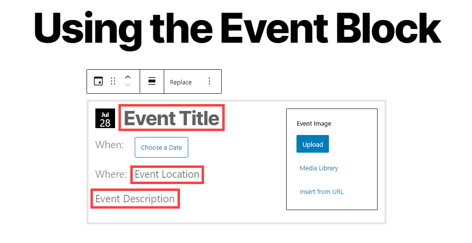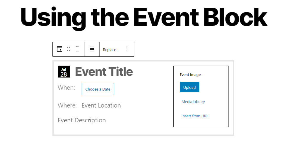 该块本身允许您添加事件、时间和位置的描述,并将图片添加到显示给访问者的卡片中。此外,您还有特定于区块的选项和设置,您可以调整这些选项和设置,以使区块更适合您网站的设计和您正在显示的事件的外观。
