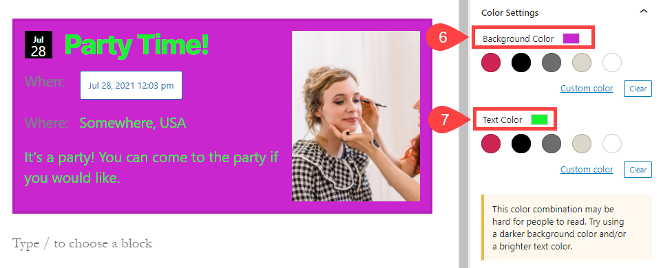 幸运的是,编辑器会警告那些对颜色组合不甚了解的人,并且会在您选择的组合难以阅读时发出警告。