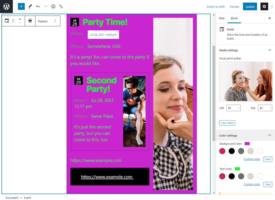 活动区块中的每个单独元素都可以单独调整。您可以将新创建的事件块视为您正在处理的文章或页面的较小内容区域。每个子事件都可以有自己的设计和图像,以及每个段落区块或其他任何内容。根据您选择的区块,块的选项将全部显示在区块选项侧栏中的右侧。