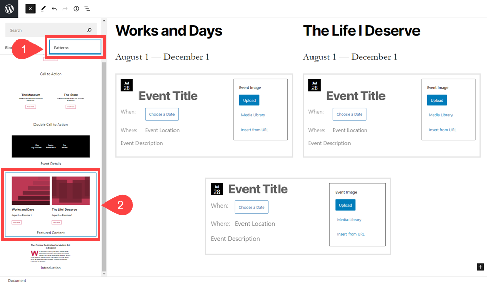 在任何可以添加区块的情况下,您都可以选择左侧边栏中的“模式”选项卡。选择一个会将其添加到您的模板中,您可以从那里开始。在上图中,我们只是在模式放入的每一列的底部添加了一个事件块,并在默认页面列中添加了一个。因为古腾堡编辑器允许在任何地方进行调整,您也可以尝试创建自己的模式。这样,您的活动就不会在标准网格或列表中丢失。