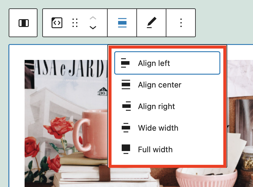 如果您选择居左对齐或居右对齐,内容将相应移动并缩小尺寸。选择其他三个选项中的任何一个都会使其更大,占据大部分页面宽度。