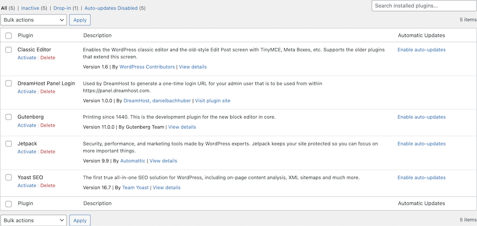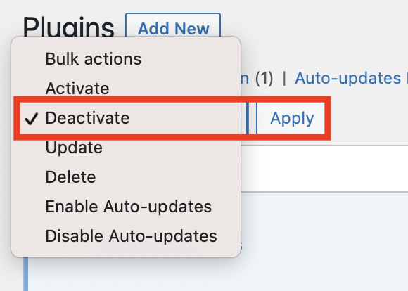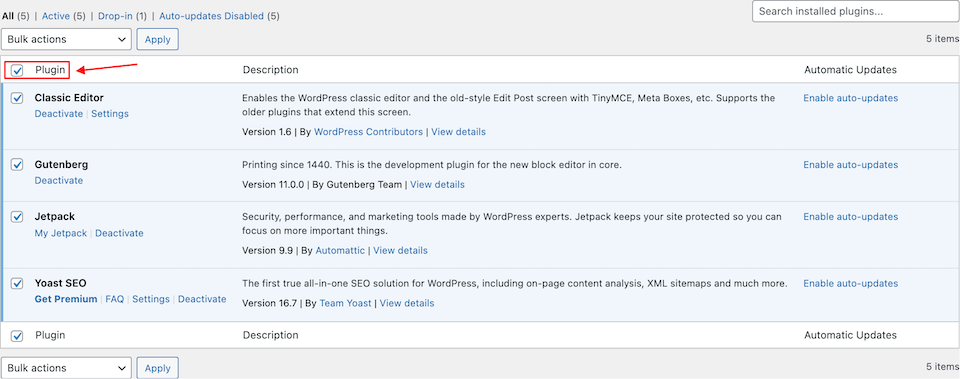 如果您有很多插件需要停用,您可以选中列表顶部插件左侧的框,这将自动选中每个插件左侧的框。