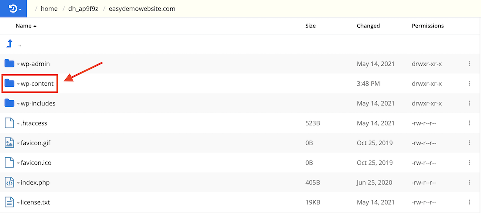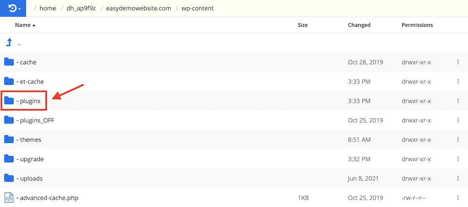 也可以使用FTP这种方式停用您的WordPress插件。如果上述步骤不起作用,这是排查插件问题的更彻底的方法。连接到FTP后,进入WordPress安装目录的wp-content文件目录。
