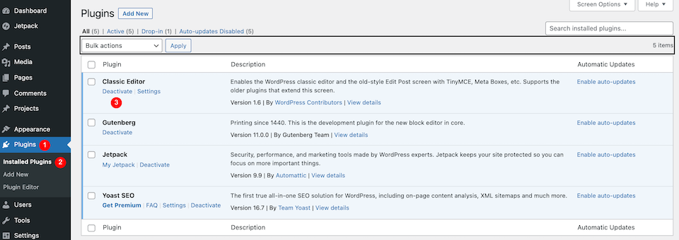 首先,尝试停用所有 WordPress 插件。转到左侧边栏中的插件>已安装插件。然后,在每个插件下,单击停用。