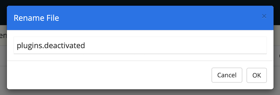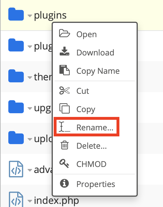 将plugins.deactivated文件夹的名称改回“plugins”。当您刷新WordPress插件页面时,一切都应该恢复正常,除了插件仍将被停用。