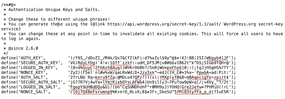 在您要更改的文件中,查找Authentication Unique Keys and Salts部分。它看起来像这样: