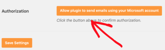 保存设置时,必须向下滚动到 WP Mail SMTP 设置中的授权部分,然后单击“Allow plugin to send emails using your Microsoft account”按钮。