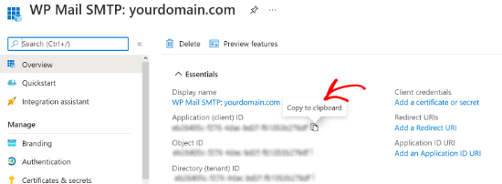 Microsoft Azure 现在将跳至另一个界面,您将在其中看到Application (client) ID。只需单击“Copy to clipboard”按钮即可复制您的应用程序 ID。