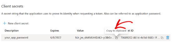 单击“Add”按钮后,Microsoft Azure 将生成应用程序密码。您可以继续并单击“Copy to clipboard”按钮复制值列下给出的密码。