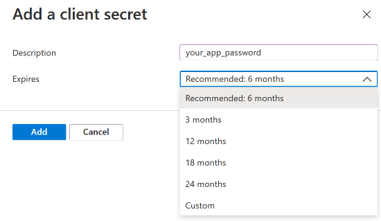 Microsoft Azure 允许您选择预设的到期时间(3 个月、6 个月、12 个月等),或者您可以设置自定义时间范围。