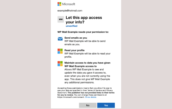 单击该按钮后,您将被重定向到 Microsoft 权限表单。要做的就是单击底部的“Yes”按钮,这将允许 WP Mail SMTP 连接到您的 Microsoft 帐户。