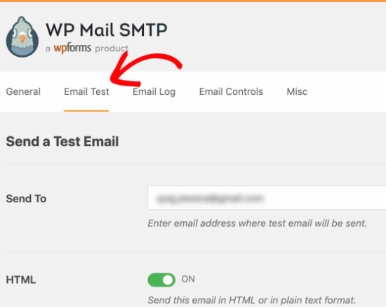 要发送测试电子邮件,只需转到 WP Mail SMTP » Settings,然后单击顶部的 Email Test 选项卡,输入接收测试邮件的电子邮箱地址后,点击“Send Email”。