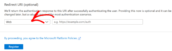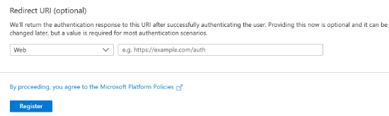 接下来,将 URL 粘贴到 Microsoft Azure 应用程序注册表中,然后单击“Register”按钮。