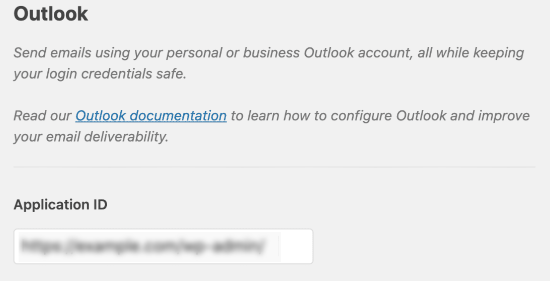 之后,您可以在 WP Mail SMTP 设置中输入复制的应用程序 ID。转到 WP Mail SMTP 设置窗口并将值粘贴到 Application ID 字段中即可。