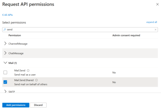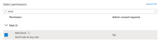 在“Select permissions”搜索栏中输入相同的搜索词“send”。点击下面展示的“Mail”选项卡,然后选中 Mail.Send 的复选框。