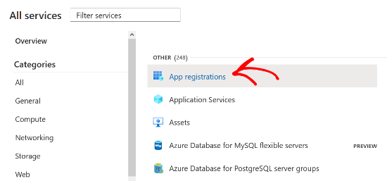 在下一个界面上,您将看到 Microsoft Azure 提供的不同服务。您可以向下滚动到“Other”部分,然后单击“App registrations”选项。