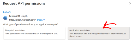 单击“+ Add a permission”按钮并再次选择“Microsoft Graph”来再次重复 API 权限步骤。但是,这次选择“Application permissions”选项。