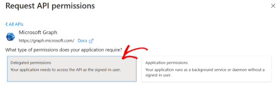 在下一个界面上,Microsoft Azure 将询问您的应用程序需要什么类型的权限。您可以选择“Delegate permissions”选项。