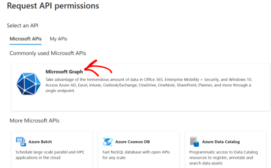 将从右侧滑入一个新窗口以请求 API 权限。您必须选择 Microsoft Graph 选项来设置 API 权限。