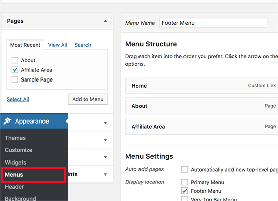 只需转到外观»菜单页面并将您的返利联盟区域页面添加到导航菜单。