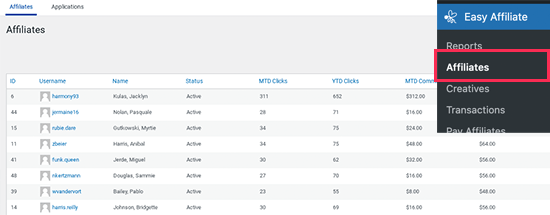 只需转到Easy Affiliate » Affiliates页面,就可以看到已批准或添加到网站的返利联盟列表的用户。