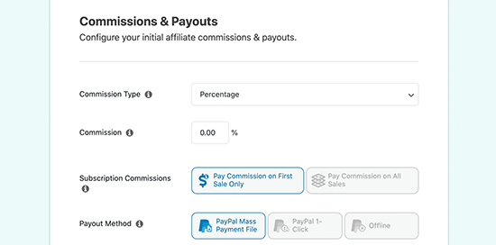 现在,系统会要求您将默认会员佣金值设置为百分比或固定金额。在此之下,您可以配置支付选项。
