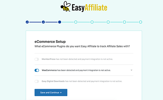 之后,该插件将尝试检测您正在使用的电子商务插件。只需单击平台旁边的切换按钮,然后继续下一步。