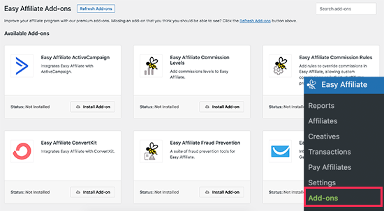 根据您购买该插件的许可计划,通过访问Easy Affiliate » Addons页面来查看可用的插件。