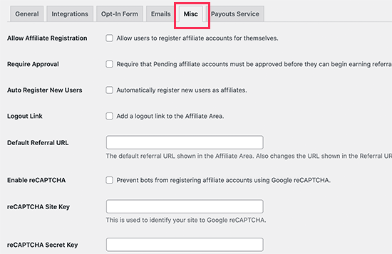 最后,切换到设置页面上的其他选项卡,为联盟计划设置高级设置。页面上的第一个选项是允许用户自行注册返利联盟。如果您希望网站用户自行注册返利联盟系统,则选中此项。