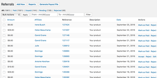 或者,您也可以通过访问Affiliates » Referrals页面并单击“Pay Affiliates”按钮来手动向返利联盟成员付款。