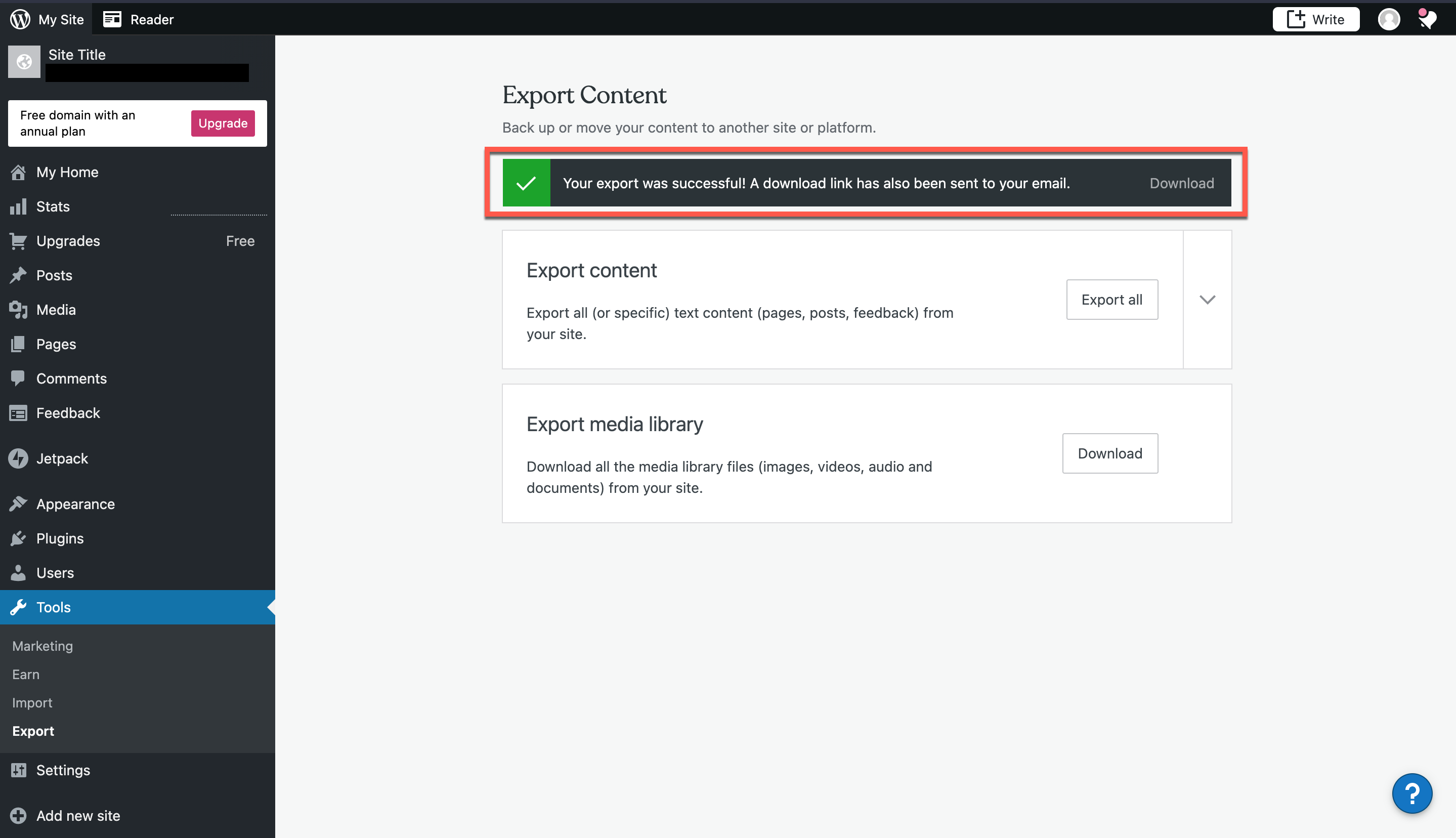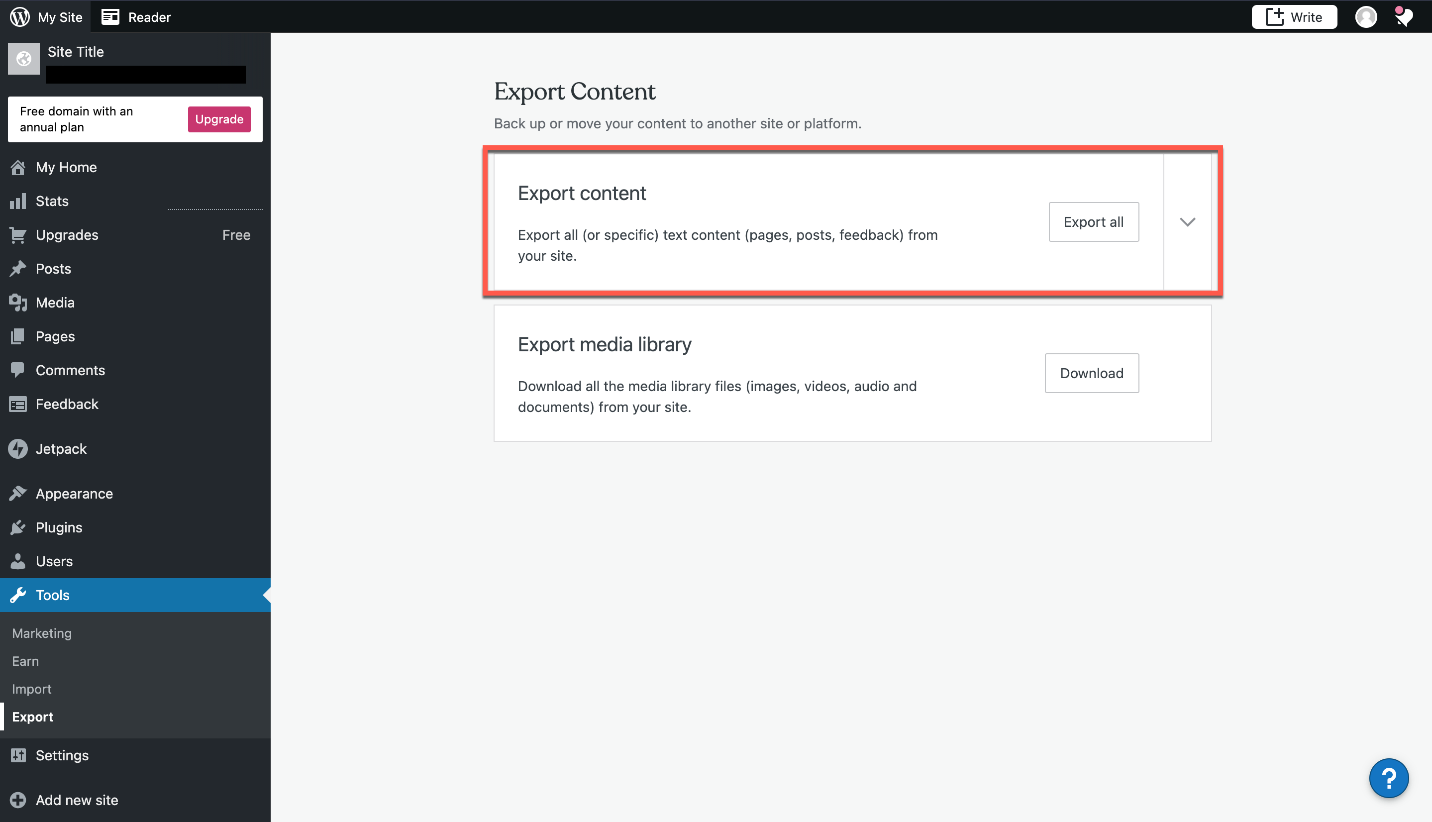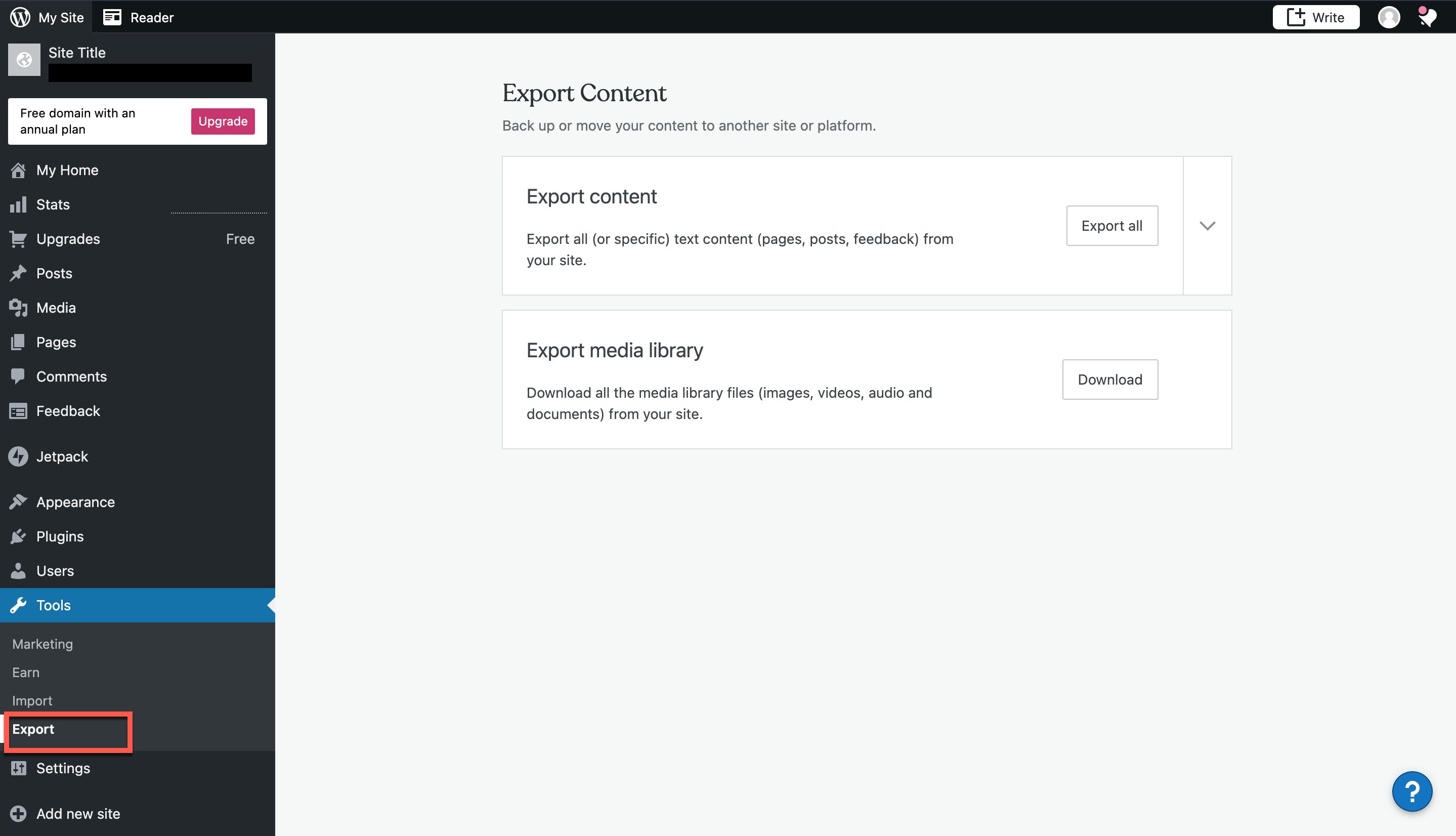 7.如果要导出“媒体库”,则可以返回到“导出”主页面来完成此操作。导出媒体库即从WordPress网站下载内容的存档文件,其中包括图像,音频,视频和文档。要导出您的媒体库,请单击下载。