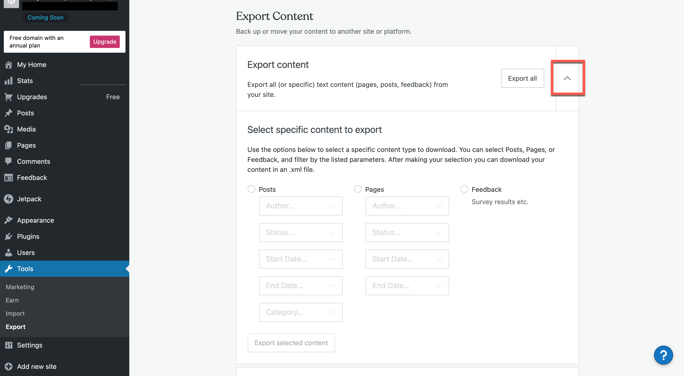 4.或者,如果您想自定义导出的站点内容,则可以单击箭头以展开选项,您将看到用于按发布,页面和Feedback来缩小导出范围的选项。