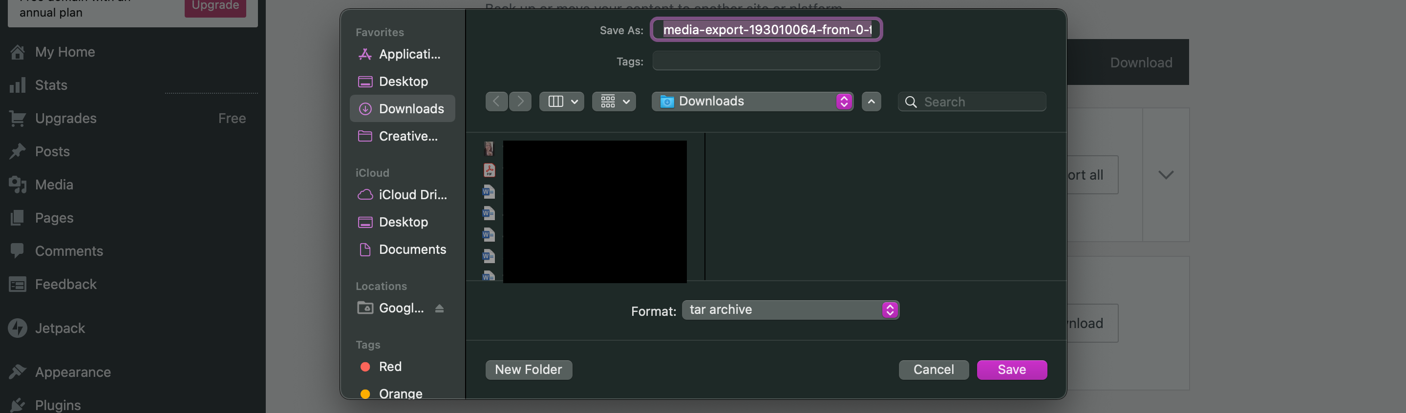8. WordPress将提示您将文件保存在特定位置。该文件将是.TAR存档,类似于zip文件。