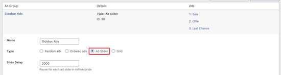 可以选择为显示随机广告(random ads),顺序广告(ordered ads),广告网格(ad grid)或广告滑块(ad slider)。我们将选择“ad slider”选项,因为这将简单地在我们的广告中滑动。