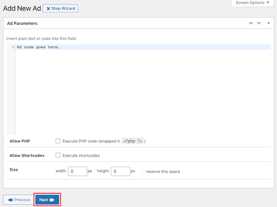 完成此操作后,您可以添加广告代码。可以是Mediavine或Ezoic之类的第三方广告网络,也可以是您在WordPress博客上出售的广告代码。
