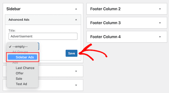 之后,给小工具命名,从下拉列表中选择广告组,然后点击“保存”。