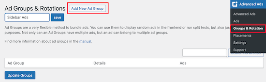 导航到Advanced Ads » Groups & Rotation,然后单击“Add New Ad Group”按钮,进行广告组命名,然后单击保存。