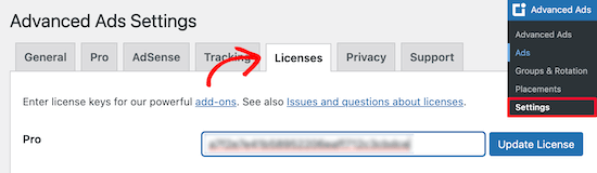 您需要输入插件专业版的许可证密钥才可以使用高级功能。转至“Advanced Ads”»“Settings”,然后单击“Licenses”菜单选项。