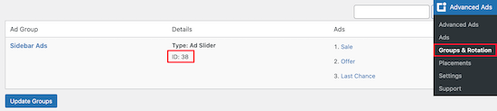 你还可以更改广告刷新方式的显示设置。导航到“Advanced Ads”»“Ad Groups & Rotations”,然后单击此前创建的广告组名称。