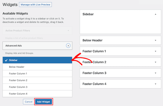 选择您要在其中显示广告组的窗口小工具区域,然后单击“添加窗口小工具”。