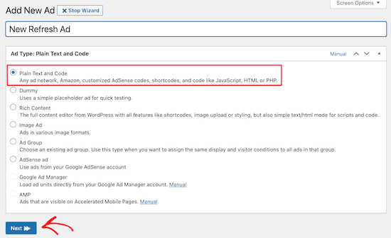 接下来,添加广告标题并选择“Plain Text and Code”,然后单击“Next”。
