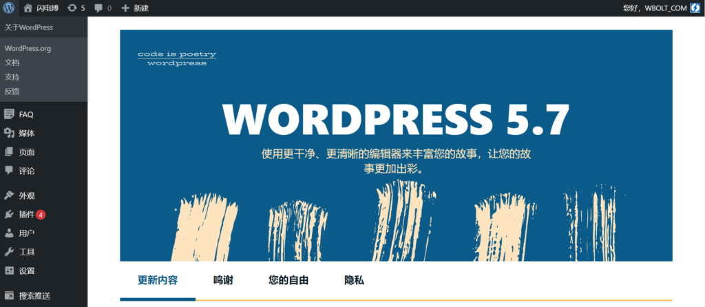 完成WordPress版本更新后会跳转至“关于WordPress”页面,以帮助你了解WordPress最新版本的新功能、鸣谢等信息。