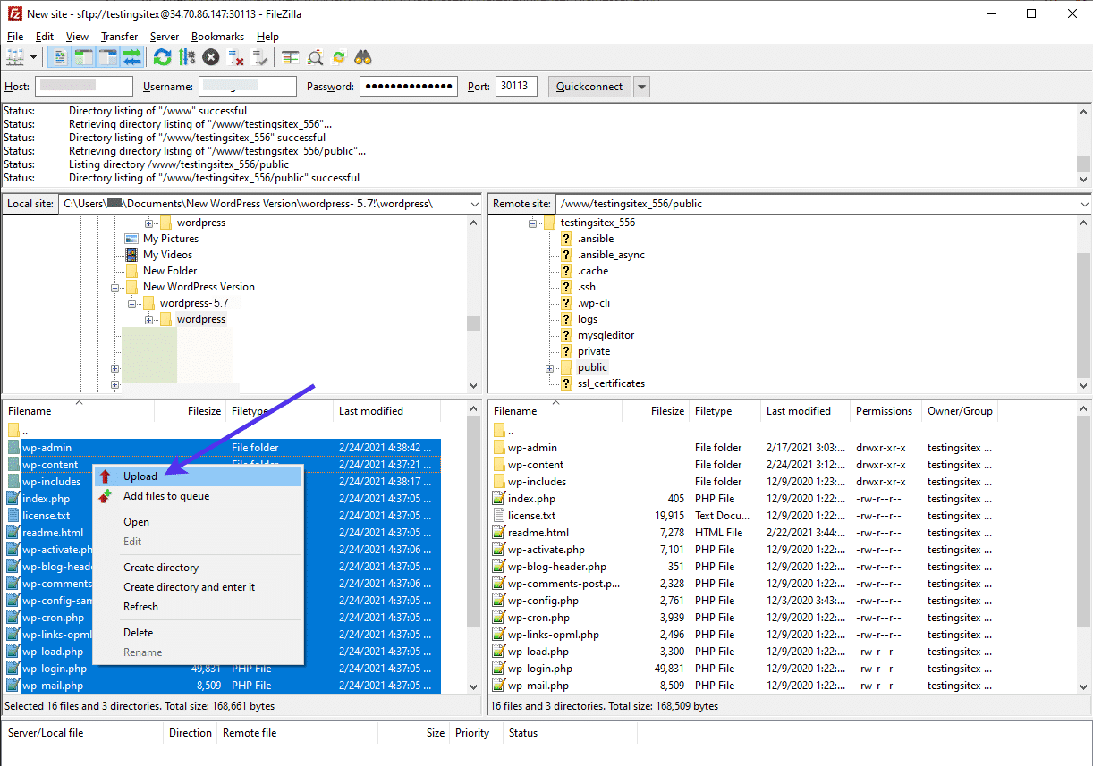 选择新的更新文件夹中的所有文件。右键单击该选择,然后单击上传按钮。