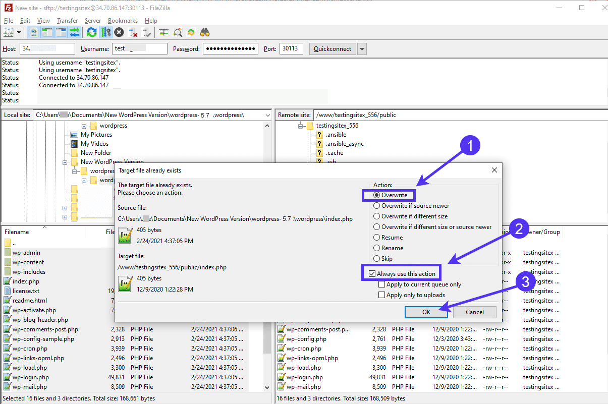 FTP客户端尝试将所有文件从计算机上传到远程网站服务器。该过程将替换旧文件,因此您应选择“覆盖”,并在单击“确定”之前始终使用此操作。