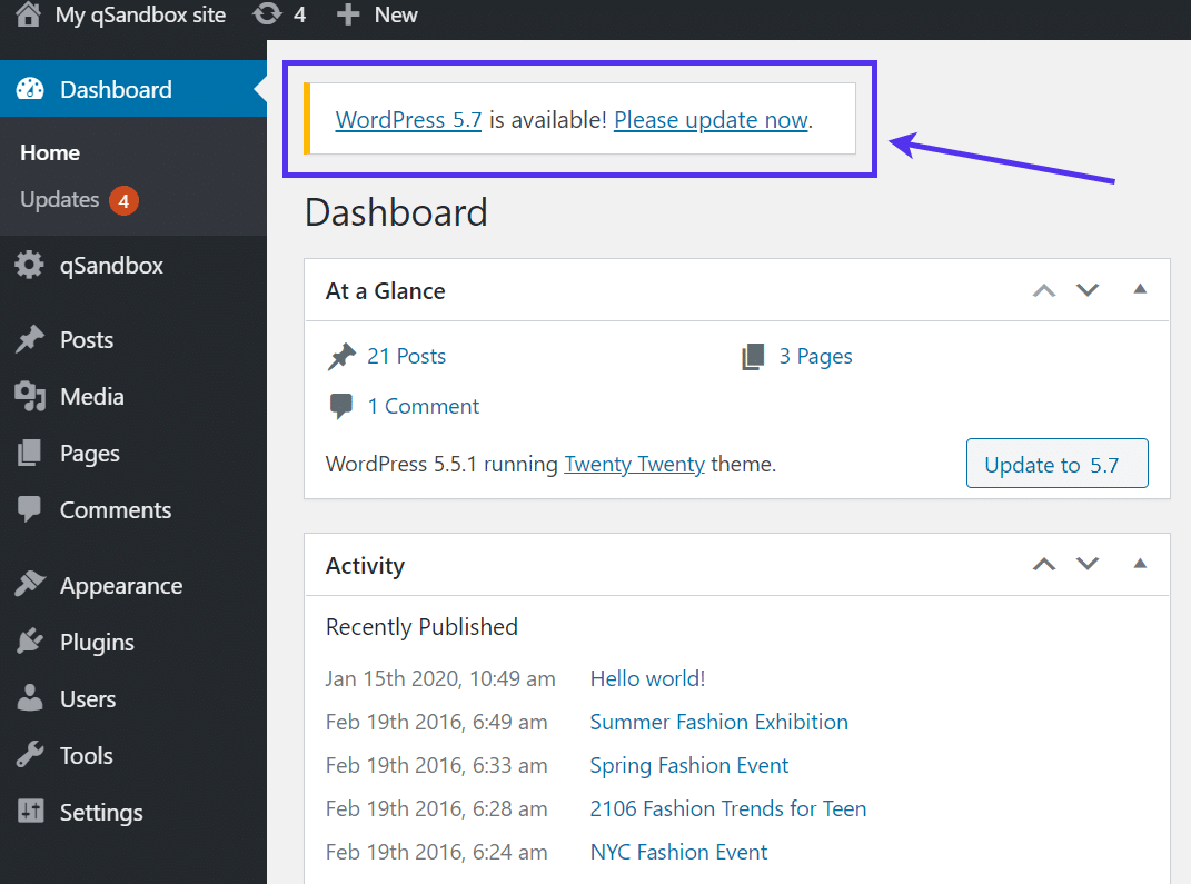 您还会在多个仪表盘位置收到提示消息,最常见的是在仪表盘顶部,会提示信息——“ WordPress Xy可用!请立即更新。”。